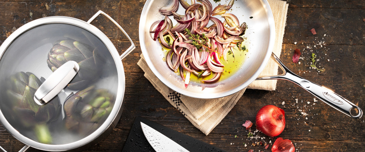 На этом перечень элитной посуды в топ-комплектации не завершается, ведь мы внесли в нее также сковороду Demeyere CONTROLINDUC Х. Эта сковорода изготовлена из высококачественной нержавеющей стали и дополнена специальной технологией, которая ограничивает повышение температуры до 250°C при использовании на индукционных плитах и предотвращает перегрев сковороды. Если же Вы предпочитаете здоровое питание и любите готовить блюда с минимальным добавлением жира – мы добавили в топ-набор еще и сковороду с антипригарным титановым покрытием Demeyere ALU PRO 5.