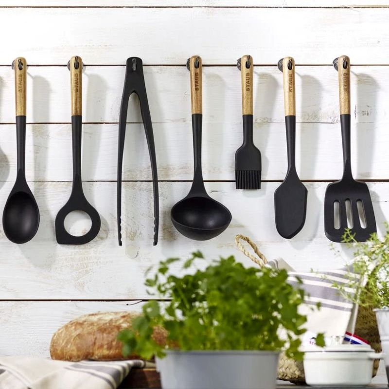 Лопатка кухонная из черного матового силикона с длинной ручкой, изготовленной из древесины акации. Подходит для поверхностей с антипригарным покрытием, не царапает чугун или керамические изделия и термостойкая до 220 ° C, так что лопатка может также использоваться для приготовления пищи. Идеально подходит для переворачивания, разделки и сервировки.