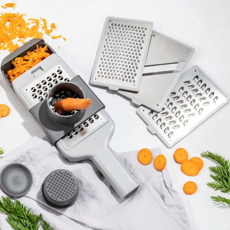 Мультитерка из серии ZWILLING Cut сочетает в себе мультирезку, овощерезку и ручную терку. Благодаря четырем сменным ножам она многофункциональна и обрабатывает фрукты и овощи так же легко, как твердый сыр, орехи или шоколад. Вы можете без проблем перерабатывать мелкие продукты и остатки - просто вставьте съемную насадку для еды. А благодаря встроенной защите пальцев нет риска поранить руки. Контейнер для сбора также является съемным, и благодаря прорезиненному основанию также обеспечивает лучший контроль при натирании.