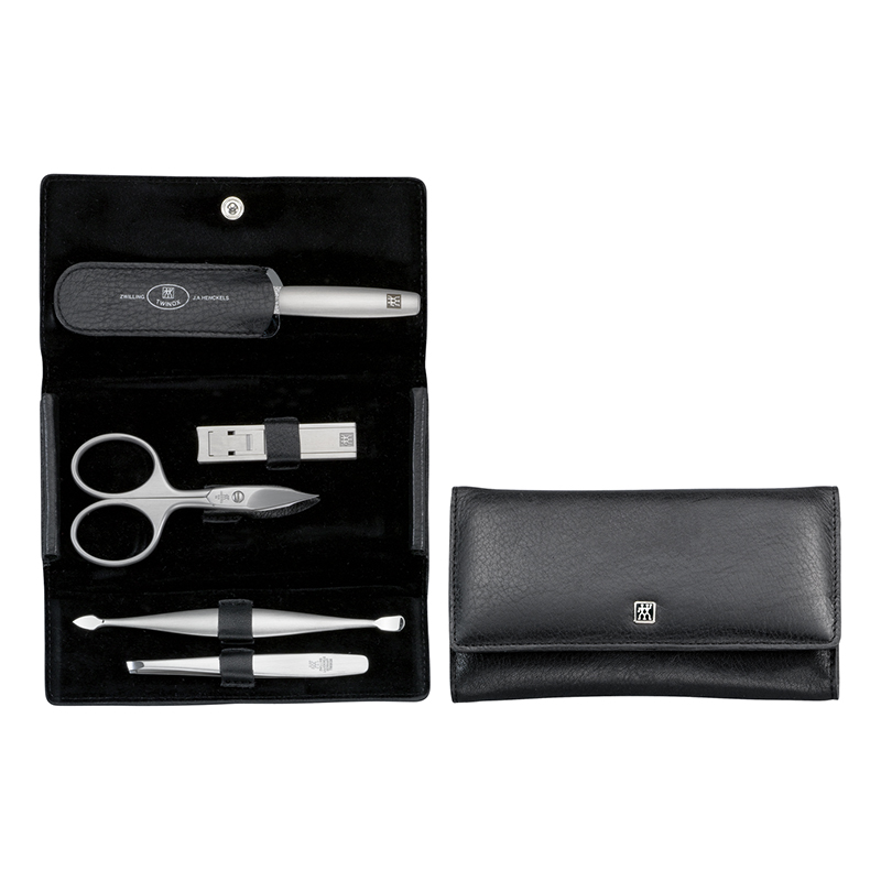 - Набор упаковано в черный кожаный футляр