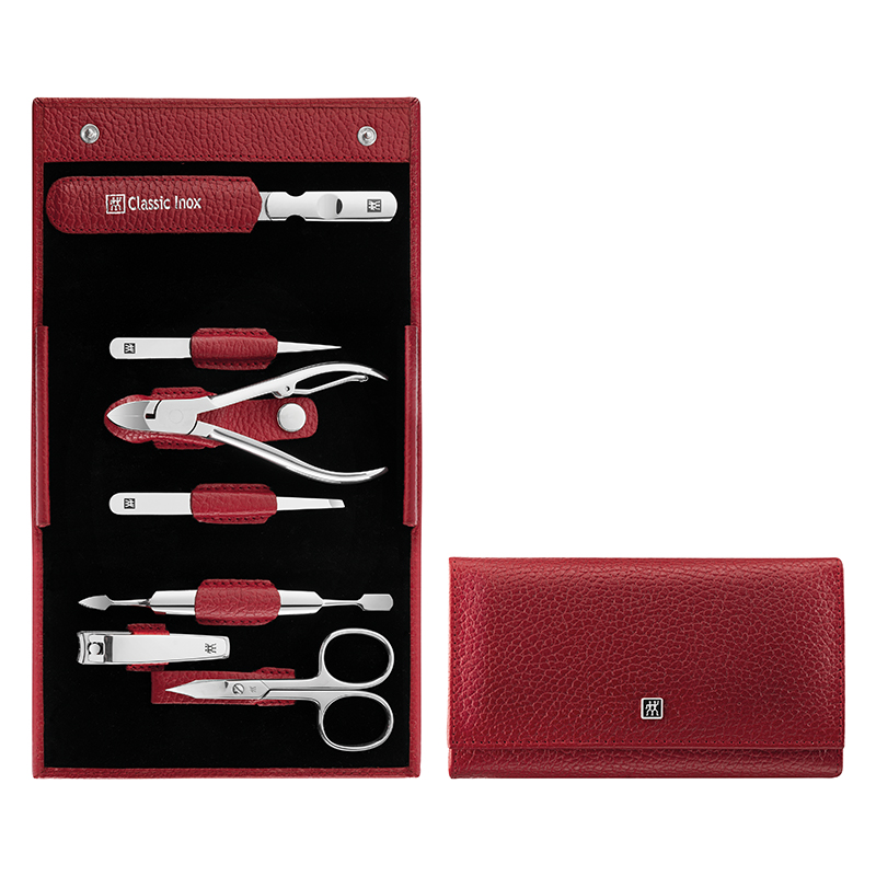 - Набор упакован в стильный красный кожаный чехол