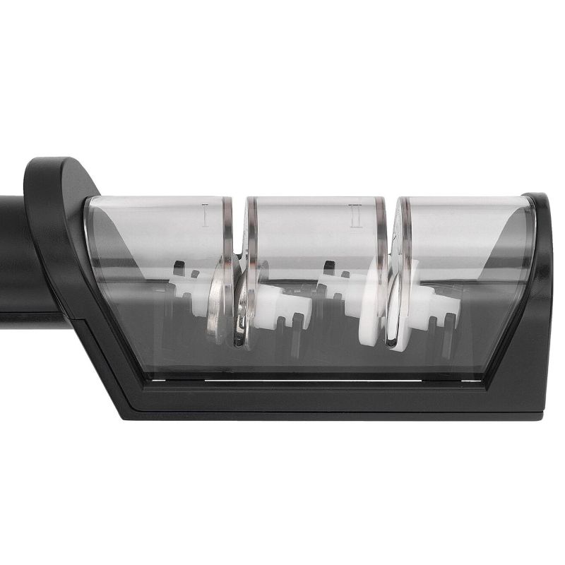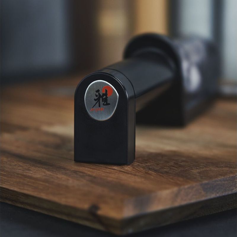 С помощью точила для ножей Miyabi Ваши ножи можно заточить более плавно и с большим комфортом. Точилка с керамическими роликами имеет уже предустановленный угол заточки так, что Ваш нож всегда будет находиться в правильном положении. Для заточки лезвие сначала протягивают через ролик с алмазным покрытием - это дает легкую базовую заточку. Затем вы несколько раз протягиваете лезвие через керамические ролики - это снова делает нож острым. Точилка для ножей надежно стоит на рабочей поверхности благодаря силиконовым вставкам на нижней стороне. Его ручка эргономичной формы изготовлена из пластика, не требующего особого ухода, и одинаково удобна как правшам, так и левшам. С помощью этой точилки для ножей вы можете точить не только ножи MIYABI, он также подходит для лезвий ножей из других марок стали, если они не имеют зубцов.