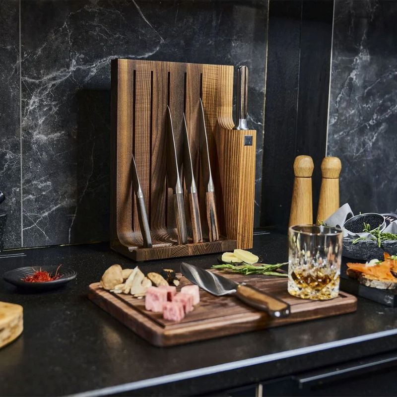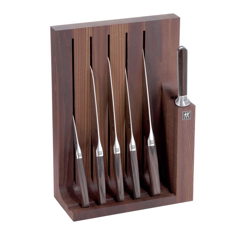 Этот элегантный блок изготовлен из ценной породы дерева бокоте и укомплектован ножами из серии ZWILLING Twin 1731 - эксклюзивная серия выпущена к 275-летию Zwilling J. A. Henkels. Сверхострые ножи выкованы из цельного куска эксклюзивной высокопрочной стали. Этот набор органично впишется в любой интерьер и кроме практической стороны еще и будет выполнять функцию главного украшения на вашей кухне. Набор находится в красочной упаковке и может являться эксклюзивным драгоценным подарком на любой праздник.