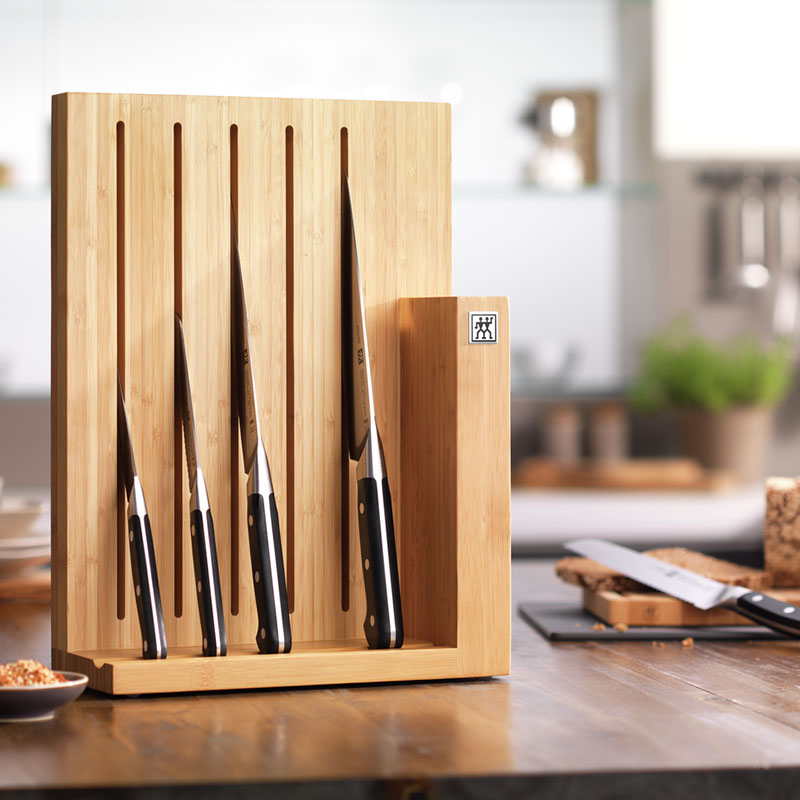 Практичный и элегантный блок из бамбука с ножами линейки ZWILLING® Pro профессионально оснащает вашу кухню и обогащает ее инновационными режущими инструментами, которые открывают совершенно новые возможности в мире кулинарии. С этим набором вы получите пять эксклюзивных кухонных принадлежностей, среди которых нож для овощей, универсальный нож, нож для мяса, поварской нож и нож для хлеба для любых повседневных ситуаций на кухне.