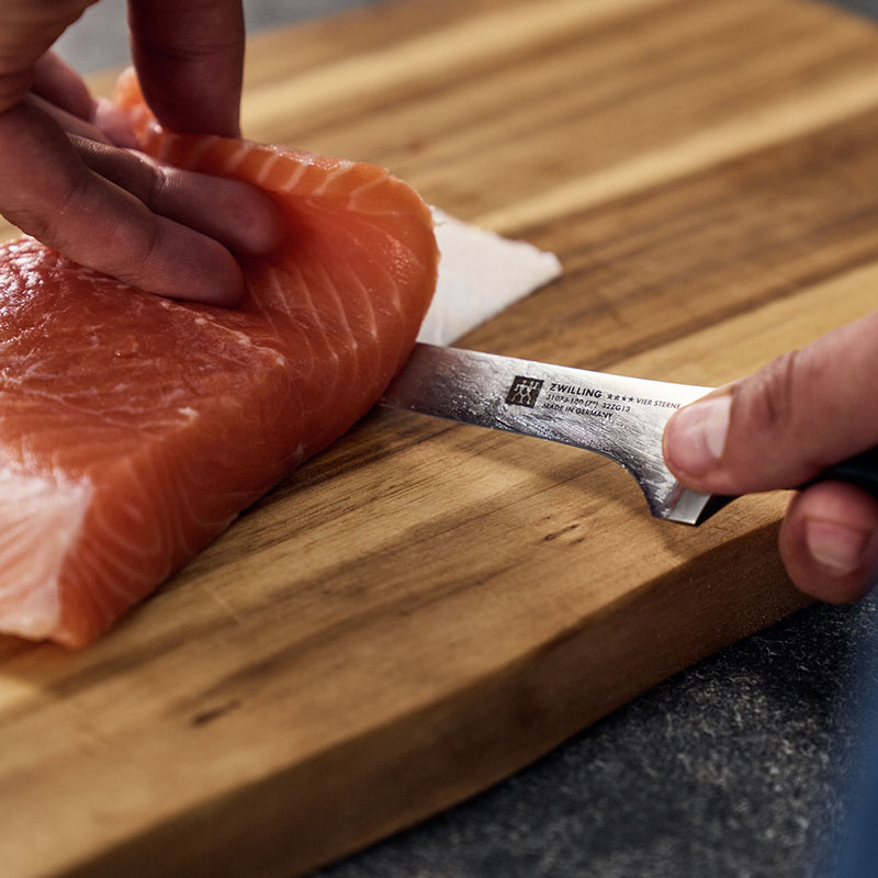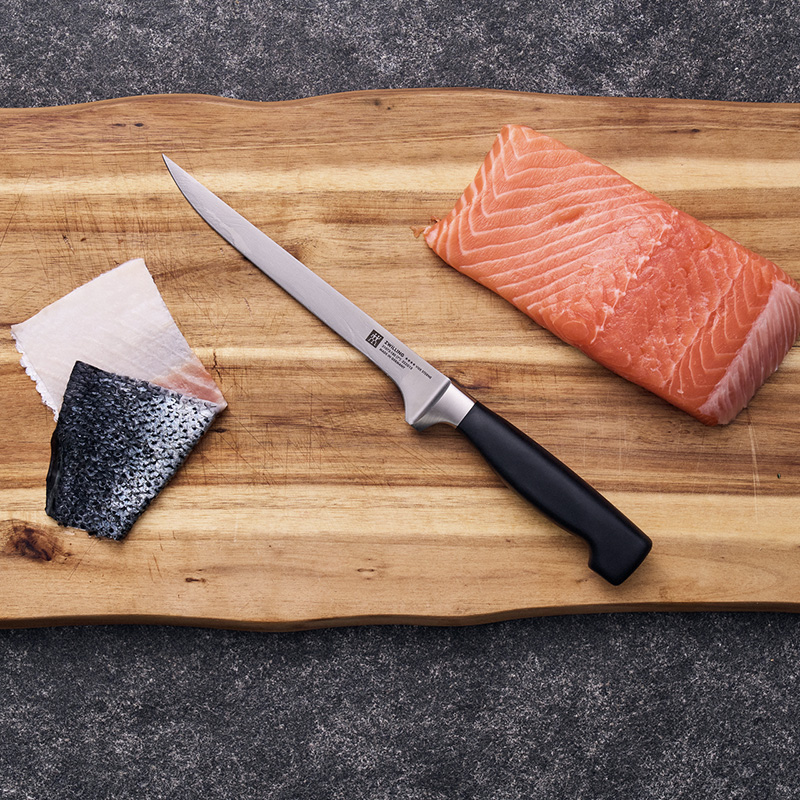 С помощью ножа для филетирования из серии ZWILLING Four Stars разделка рыбы или мяса выполняется в кратчайшие сроки. Его продуманный дизайн подходит для любого кухонного оборудования, а также обеспечивает комфортную работу. В нем предусмотрена защита для рук, так что процесс филетирования становится гарантированно безопасным и приятным.
