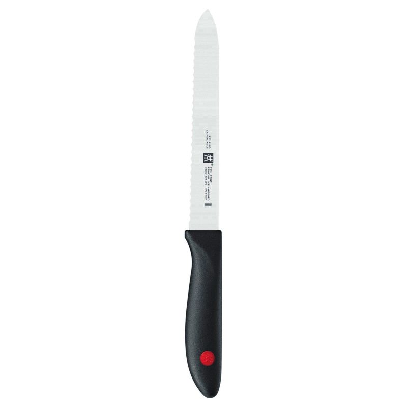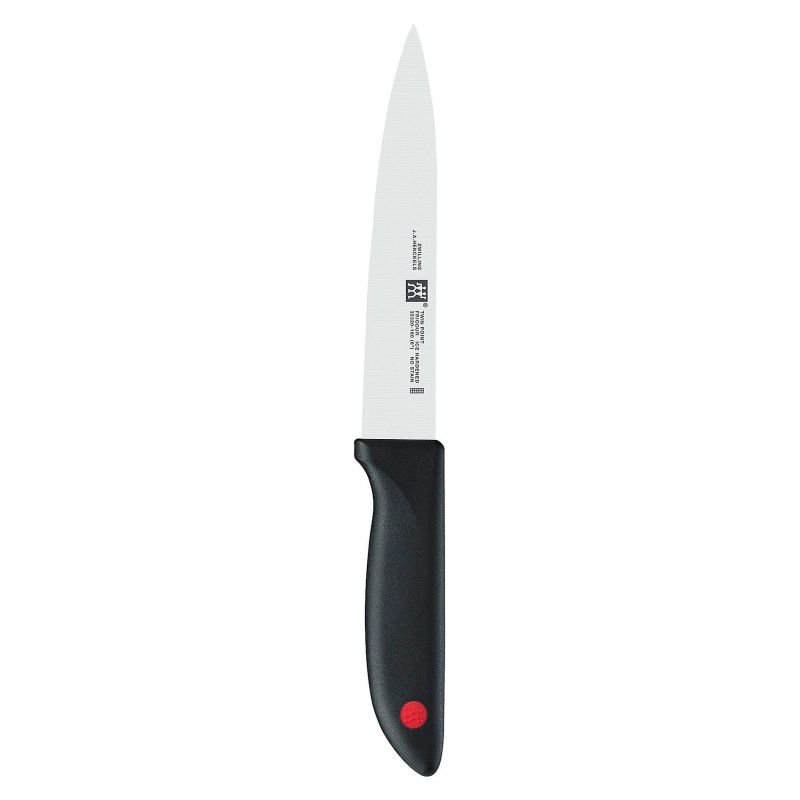 Лезвия ножей выполнены из специальной штампованной ножевой стали и закалены льдом по технологии FRIODUR®. Двухсторонняя симметричная заточка режущей кромки. Твердость по шкале Роквелла 56-58 HRC. Материал ручек: ABS-пластик со встроенным красным логотипом ZWILLING. Ножи удобно держать в руке, они безопасны в обращении и надёжны при резке. Рекомендуется мыть вручную.