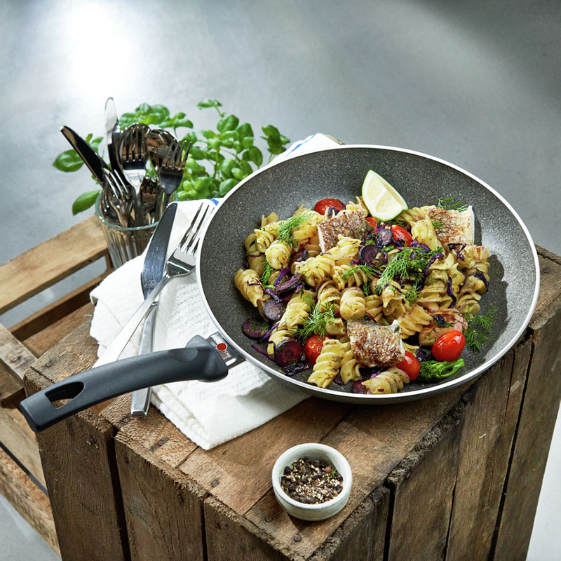 Толстостенная посуда из кованого алюминия с очень прочным покрытием отлично подходит для интенсивного использования, идеально - для мяса, рыбы и овощей. Благодаря устойчивому к царапинам антипригарному покрытию, которое дополнительно усиленное минеральными частицами, пища легко отделяется от дна сковороды и раскрывает свой чистый вкус. Вам не нужно добавлять жир или жидкости в сковороду, что позволяет готовить здоровую пищу с низким содержанием жира.