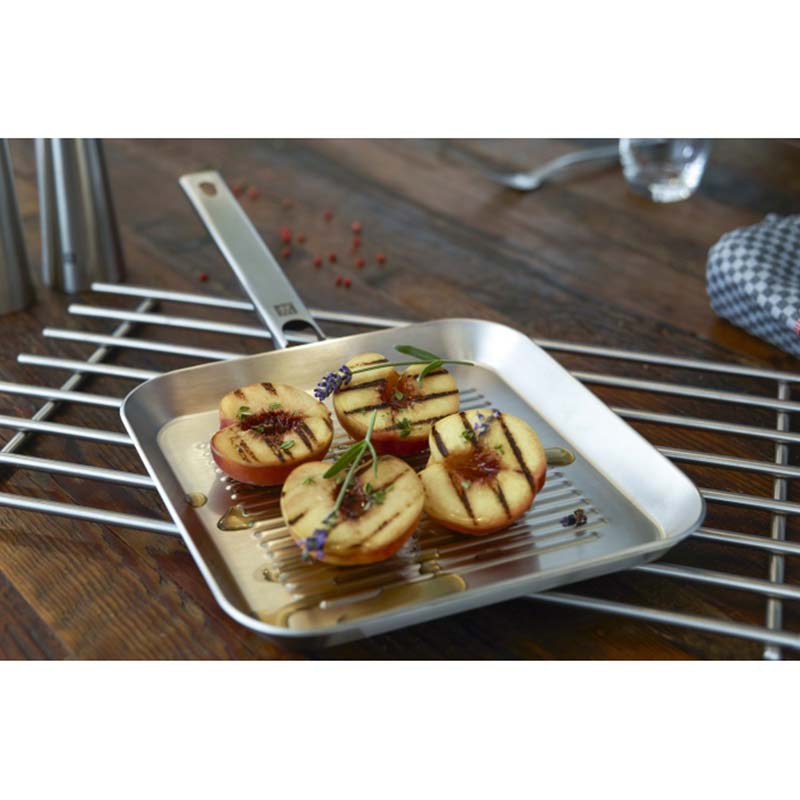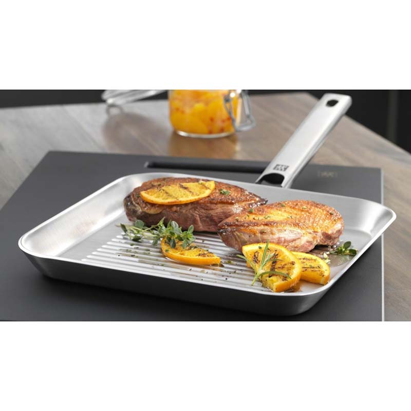 Не всегда для красивой прожарки мяса стоит включать гриль, да и не у всех он есть: если вам нужен типичный аромат и неповторимый рисунок - просто возьмите сковороду-гриль от ZWILLING Plus. Он идеально подходит для приготовления гамбургеров, колбас или стейков, для быстрого прожаривания овощей или мяса, а также для вегетарианских или веганских вариантов с очень низким содержанием жира. Сама сковорода-гриль нагревается за очень короткое время - тепло равномерно распределяется и сохраняется, что, в свою очередь, позволяет экономить энергию.