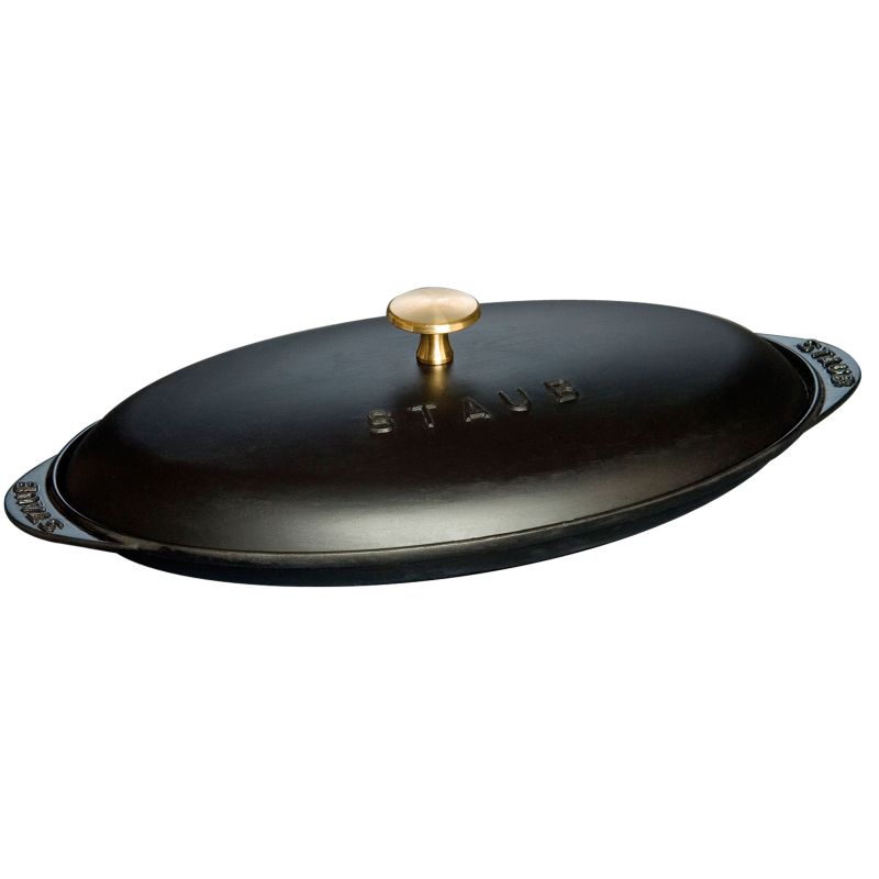 Блюдо изготовлено из литого чугуна и покрыто с внешней и внутренней стороны двойным слоем эмали. Каждое изделие уникально, так как расплавленный чугун заливается в одноразовую форму из песка. Благодаря эмалированному покрытию блюдо обладает антипригарными свойствами, устойчивое к царапинам. Чёрное эмалированное покрытие внутри блюда позволяет сохранить подлинный вкус продуктов. Внешнее эмалированное покрытие создаёт неповторимый стиль на Вашей кухне и защищает от внешних воздействий. Плотно прилегающая крышка удерживает влагу внутри емкости, что делает блюдо более сочным и полезным.