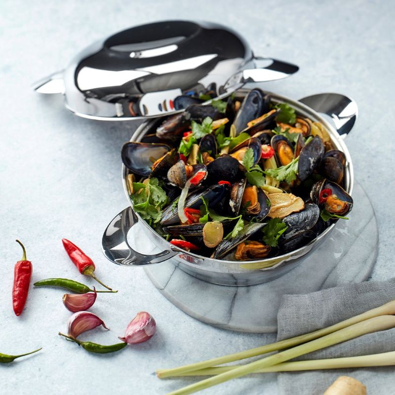 Эта посуда специально созданная для приготовления и красивой подачи вкуснейших морских деликатесов - мидий. Отлично подойдет как для уютного романтического ужина с вином на берегу моря, так и для шведского стола на шумной вечеринке. Идеально подогнанная глубокая крышка служит элегантной чашей для пустых раковин.