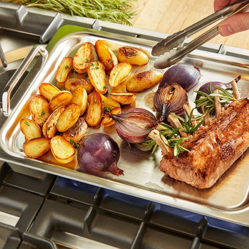 Эта универсальная посуда отлично подходит как для обычной плиты (она помещается на двух конфорках одновременно, а эксклюзивный 5-слойный материал оптимально распределяет тепло), так и для стейков на гриле или для запекания овощей или птицы в духовке. Если хотите привнести в свою кулинарию немного экзотики - это деко можно использовать для приготовления блюд в стиле теппаньяки.