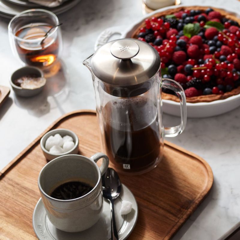Френч-пресс Zwilling из серии Sorrento сделан из боросиликатного стекла - высококачественного материала, который выдерживает высокие температуры, а благодаря двойным стенкам ваш напиток будет оставаться горячим очень долго. С ним вы сможете насладится свежезаваренным чаем или чудесным ароматным кофе. Если вы решили приобрести себе или на подарок этот френч-пресс, к нему в комплект отлично подойдут чашки для эспрессо из серии Sorrento Plus.