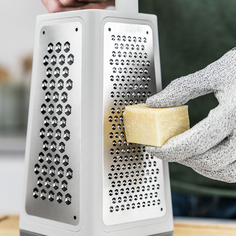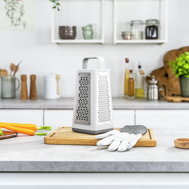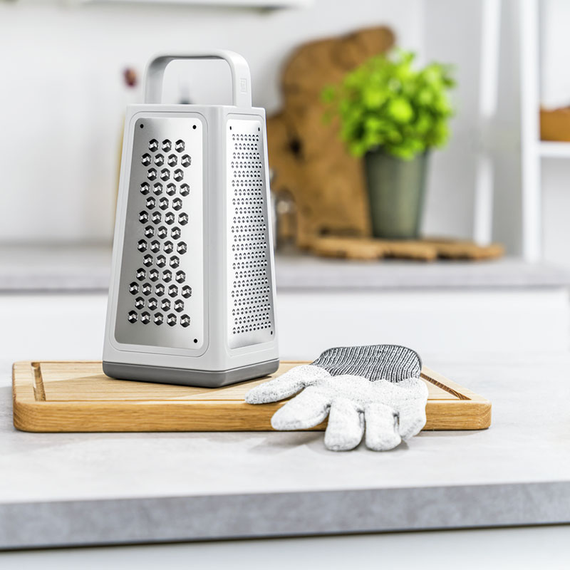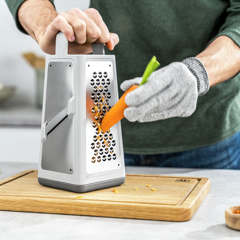 При обработке небольших продуктов и остатков пищи всегда было важно следить за своими пальцами. Но теперь есть защитные перчатки ZWILLING Cut для большей безопасности на вашей кухне. Перчатка состоит из стойких к порезам материалов HPPE, спандекса и стекловолокна, она не изнашивается и безопасна для пищевых продуктов, так что вы можете не беспокоиться об этом.