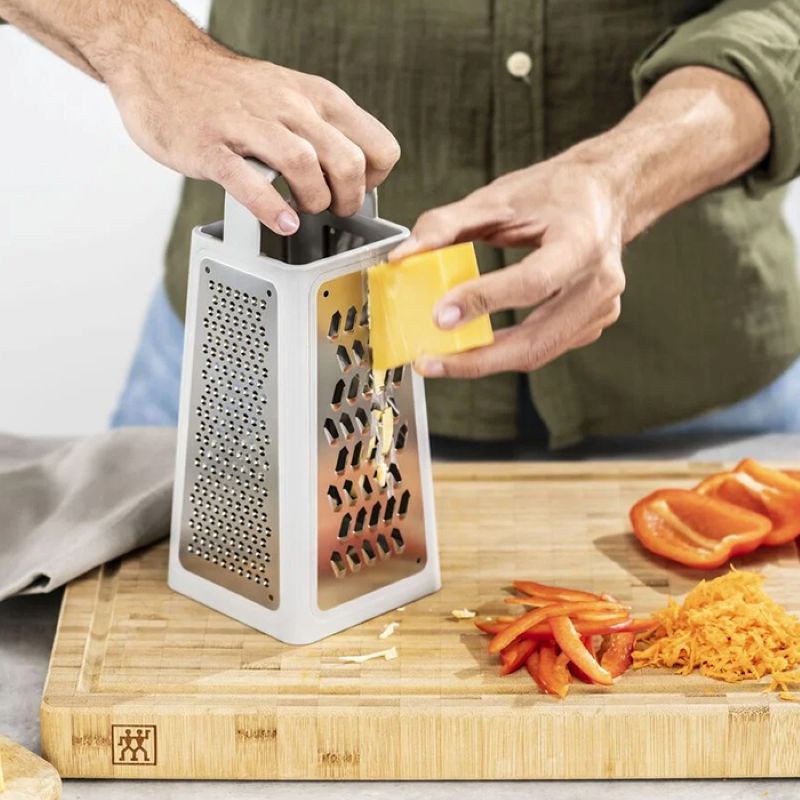 Якщо ви любите готувати легку та корисну їжу і вам до вподоби різноманітне меню, тоді терка для овочів 6-в-1 серії ZWILLING CUT стане влучним доповненням до вашої кухні. Завдяки цьому універсальному приладу можна натерти або нарізати сир, фрукти, овочі, горіхи і навіть шоколад. Терка розроблена міланськими дизайнерами Маттео Туном і Антоніо Родрігесом і вражає своїм футуристичним дизайном.