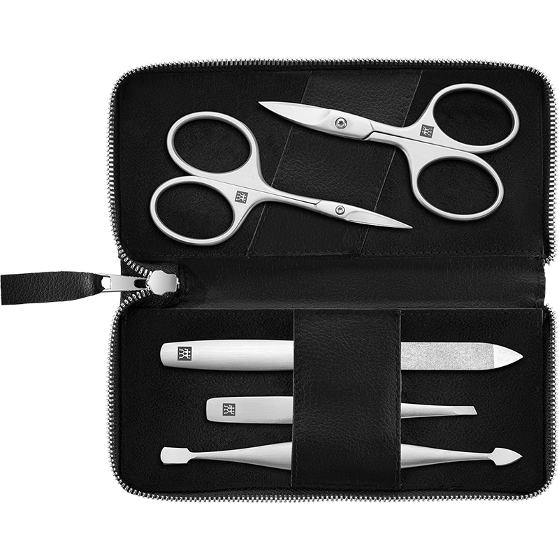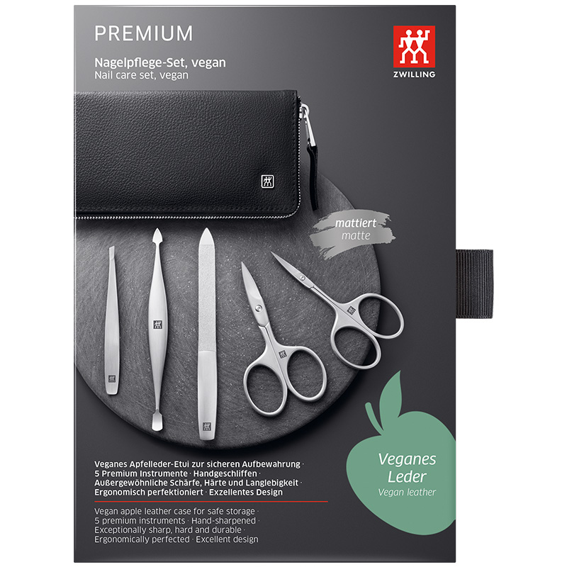 Професійний набір для догляду за нігтями PREMIUM із 5 предметів ідеально підходить для комплексного догляду за нігтями і особливо зручний для безпечного зберігання інструментів вдома або в дорозі. Футляр з веганської (еко) шкіри з застібкою-блискакою та оксамитовим внутрішнім покриттям. Надзвичайно точна обробка із використанням матової нержавіючої сталі та вишуканого скла гарантує виняткову довговічність і функціональність у привабливому дизайні.