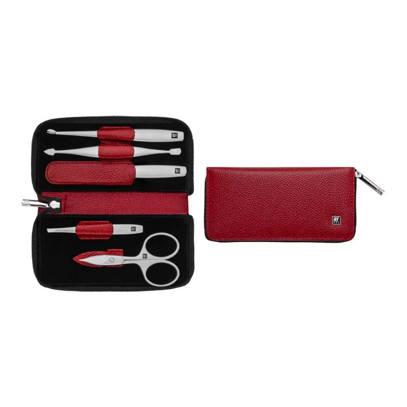 набір упакований у червоний шкіряний футляр з оксамитовим покриттям всередині.