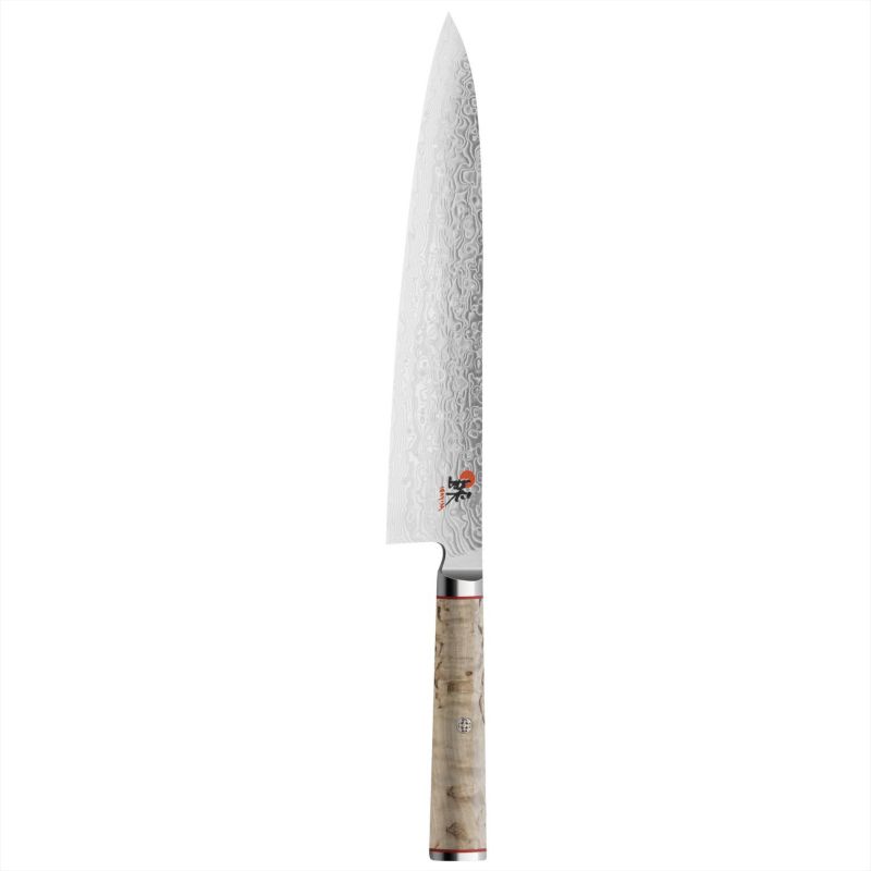 Gyutoh - японський ніж, який традиційно застосовується при обробці м'яса, але його також можна використовувати для нарізки овочів і риби. Даний інструмент - ідеальний представник цього типу ножів, він чудово підходить для обробки м'яса чи риби. Завдяки тонкому, але стійкому лезу ви можете добитися повністю контрольованого і акуратного зрізу. А ергономічна ручка з деревини карельської берези - приємне доповнення до унікального дамаського візерунку самого леза.