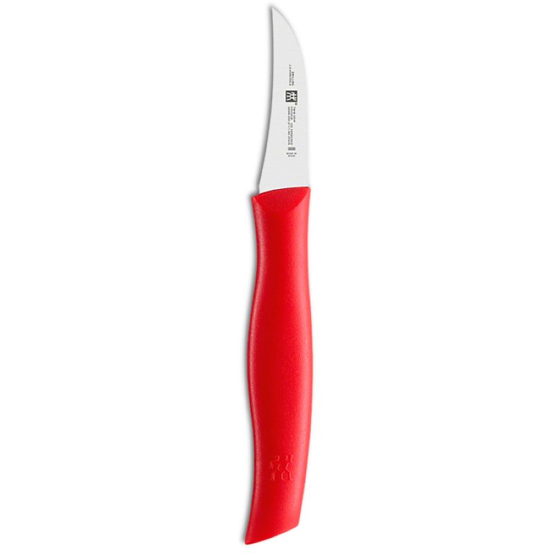 Цей яскравий ніж із серії TWIN Grip виділяється пластиковою ручкою яскраво-червоного кольору та зігнутим лезом з міцним вістрям. За допомогою цього практичного ножа від ZWILLING ви зможете в найкоротші терміни очистити картоплю, фрукти і овочі.