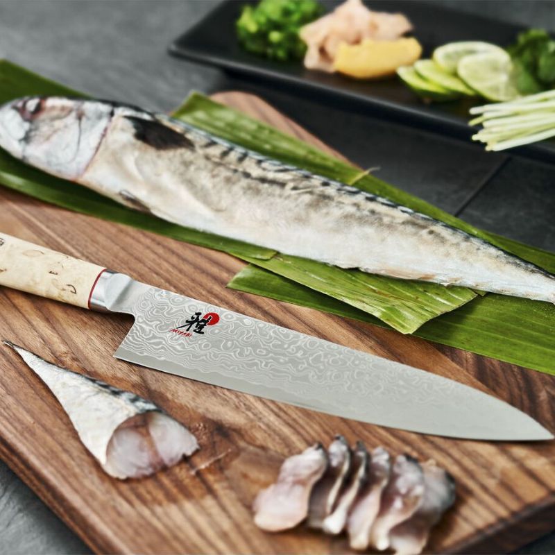 Gyutoh - японський ніж, який традиційно застосовується при обробці м'яса, але його також можна використовувати для нарізки овочів і риби. Цей елегантний екземпляр вражає не лише своєю гостротою, але й міцністю леза, а завдяки неповторному малюнку дамаської сталі - кожен окремий ніж унікальний. Ручка за японською традицією виготовлена з деревини карельської берези і має ергономічну форму.