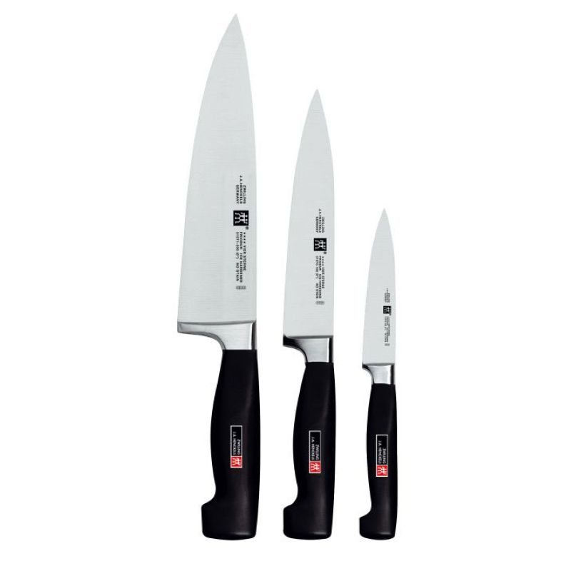 З цим набором із серії ****Four Star ви отримаєте три різних ножі, з якими ви будете укомплектовані практично для будь-яких робіт з приготування їжі. Короткий ніж з гнучким лезом для овочів і фруктів, середніх розмірів ніж для нарізки м'яса - як сирого, так і приготованого, та головний інструмент кожного кухаря - довгий шеф-ніж з широким лезом.