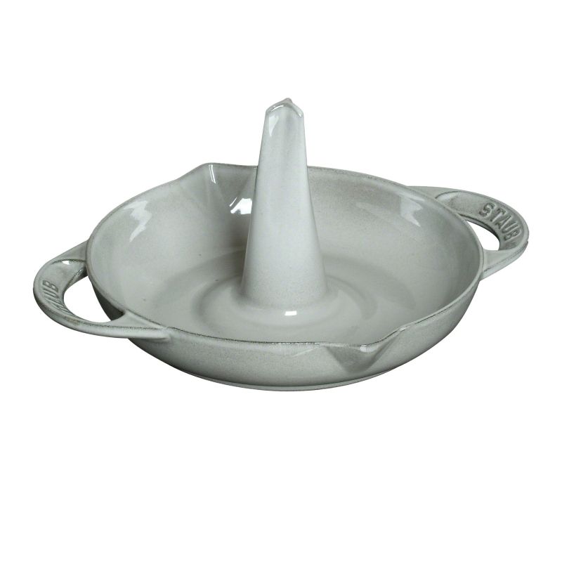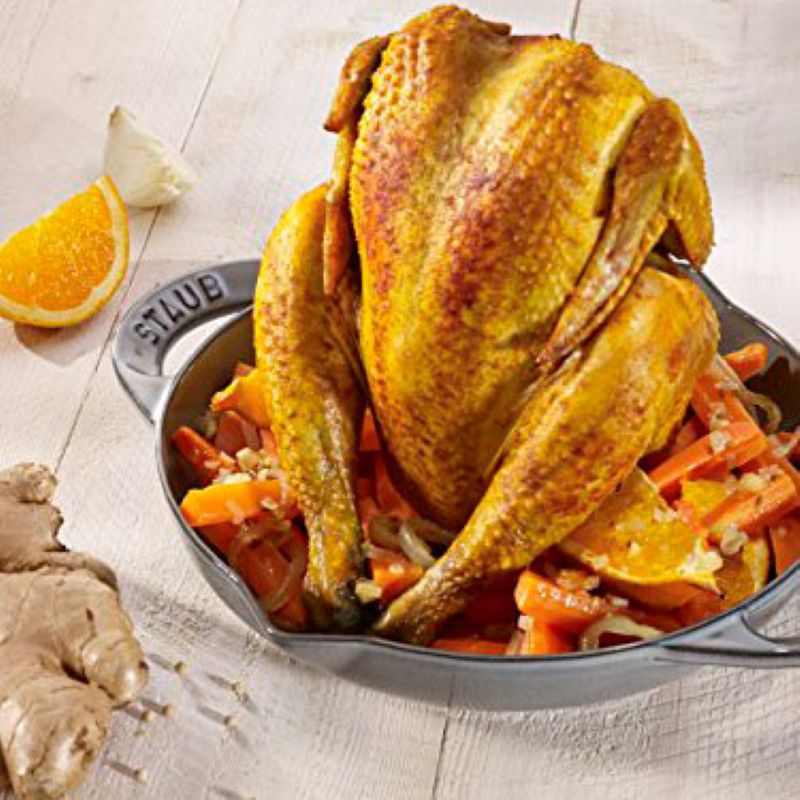 Виготовлений з литого чавуну, покритий з зовнішньої і внутрішньої сторони подвійним шаром емалі. Ідеально підходить для приготування ароматної, хрусткої курки або курчати в духовці.