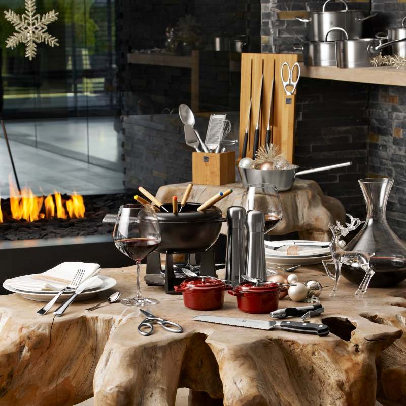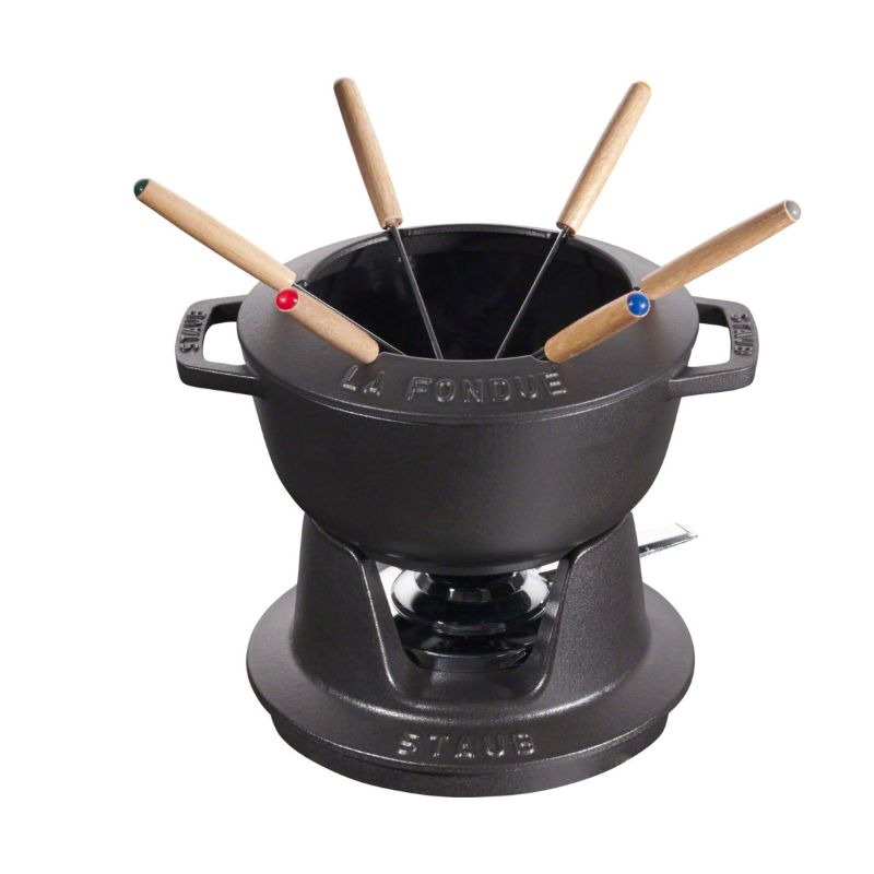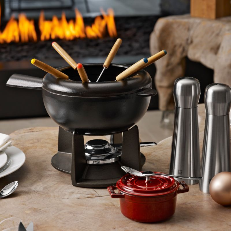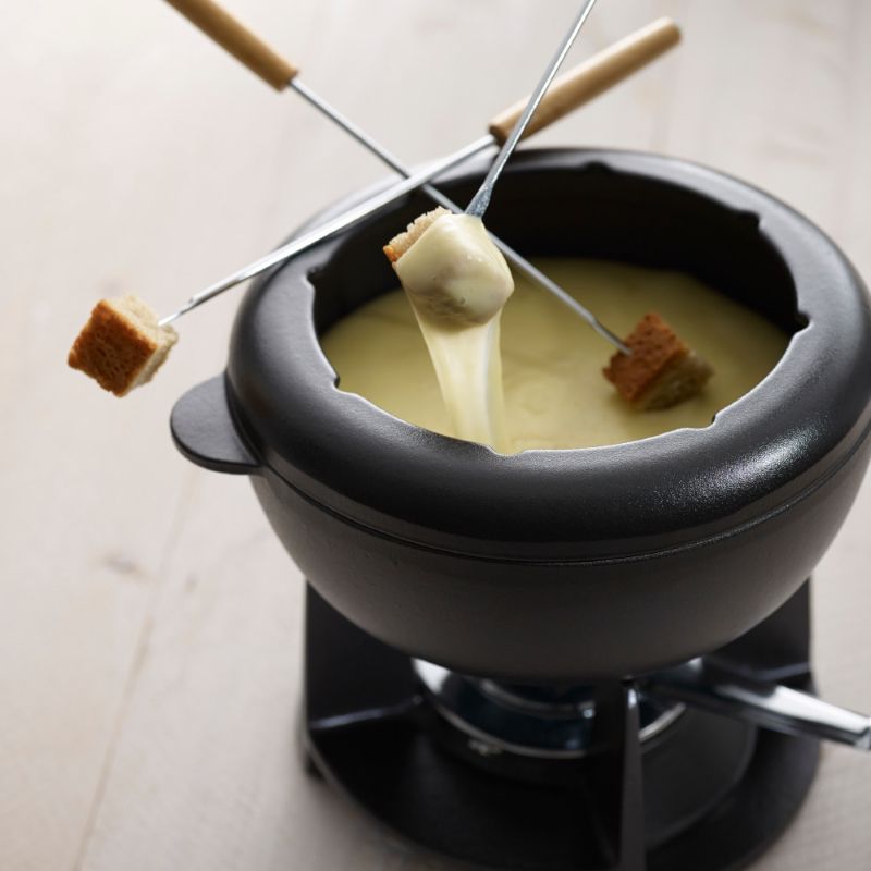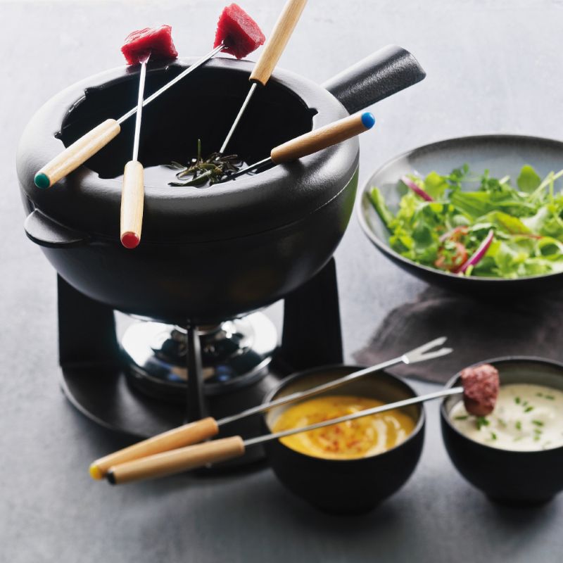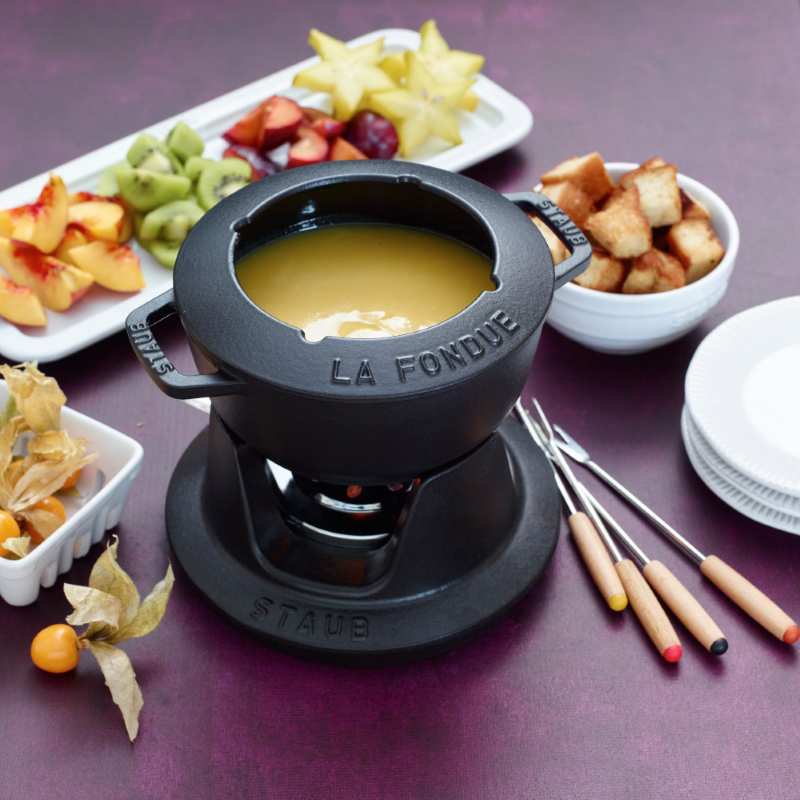 Цей чудовий набір для фондю виготовлений з емальованого чавуну, він зберігає тепло протягом тривалого часу, тому закусками можна буде насолоджуватися довший час. У ньому можна готувати страви прямо за столом: підсмажити овочі або м'ясо в киплячій олії або ж покрити фрукти ніжним сиром чи шоколадом. Поверхня каструлі гладка, легко миється та запобігає прилипанню інгредієнтів. У комплект входить пальник, але фондю можна використовувати окремо на інших джерелах тепла, в тому числі і на електричних.
