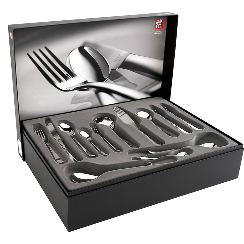 Цей набір ZWILLING Nottingham для 12 осіб складається з ложок, виделок та ножів, які чудово підійдуть як для щоденного прийому їжі, так і для особливих випадків. У комплект також входять чайні / кавові ложечки і виделочки для торта - на випадок приємного чаювання з десертними закусками. Крім того, в наборі є практичні допоміжні інструменти для сервірування, такі як ложка для супів і соусів, виделки для м'яса, ложечка для цукру - щоб приготувати собі смачну післяобідню каву.