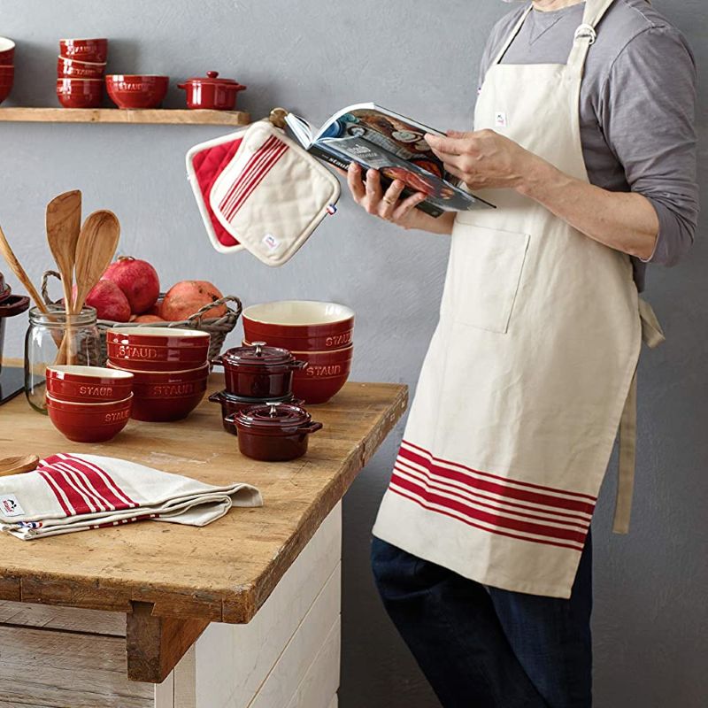 Цей практичний фартух захистить одяг від бризок води, жиру або пролитого томатного соусу. Фартух STAUB має класичну форму, також відому як фартух для французької кухні. Він доступний у розмірі 70 x 85 см і підходить для більшості дорослих завдяки регульованому шийному та довгим бічним ремням. Велика передня кишеня розділена на два сегменти для зручного зберігання кухонного приладдя або телефону.
