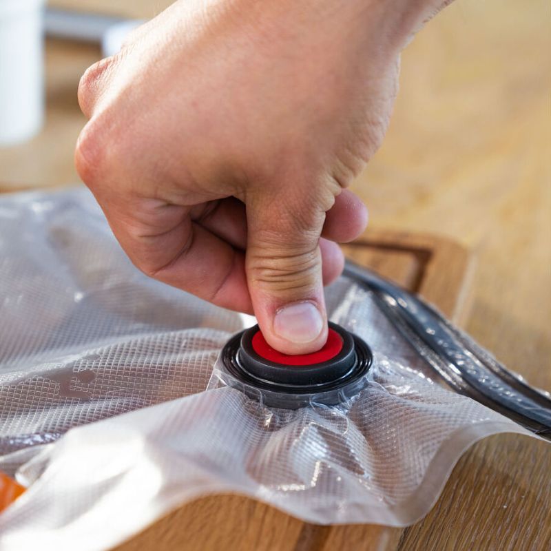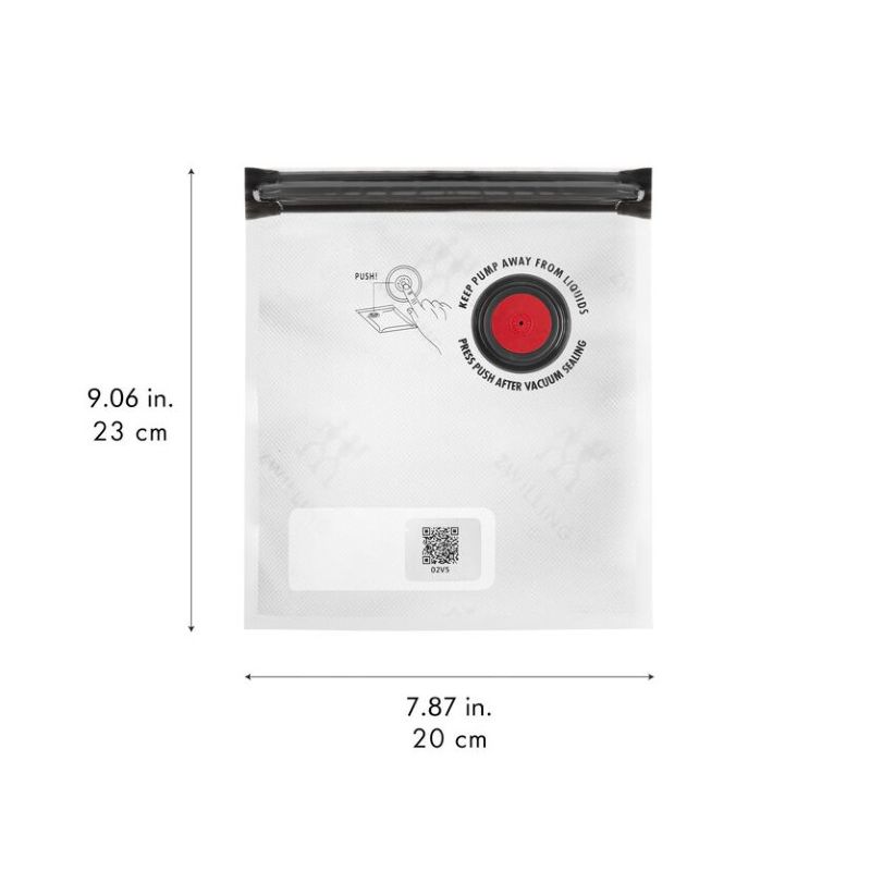Вакуумні пакети Fresh & Save застосовуються разом з вакуумним насосом і дозволяють зберігати продукти свіжими до п'яти разів довше, ніж зазвичай. З їх допомогою можна заморожувати цілі порції, розігрівати їх, зберігати продукти свіжими тривалий час або ж маринувати стейки для гриль-вечірки. Як це працює: покладіть продукти в пакет і закрийте його за допомогою зіп-блискавки. Тепер встановіть бездротовий вакуумний насос на відповідний клапан - він видалить повітря з пакету за лічені секунди і автоматично зупиниться, як тільки створиться достатній вакуум. Тепер все, що вам потрібно зробити, це натиснути кнопку в центрі червоного силіконового клапана, щоб надійно закрити його. Кожен пакет має індивідуальний ідентифікатор, щоб ви могли швидко отримати потрібну інформацію. Просто відскануйте QR-код і відстежуйти ваш пакет через додаток ZWILLING Culinary World. Завдяки функції нагадувань в безкоштовному додатку ви завжди будете знати, коли наступає крайній термін використання продуктів.