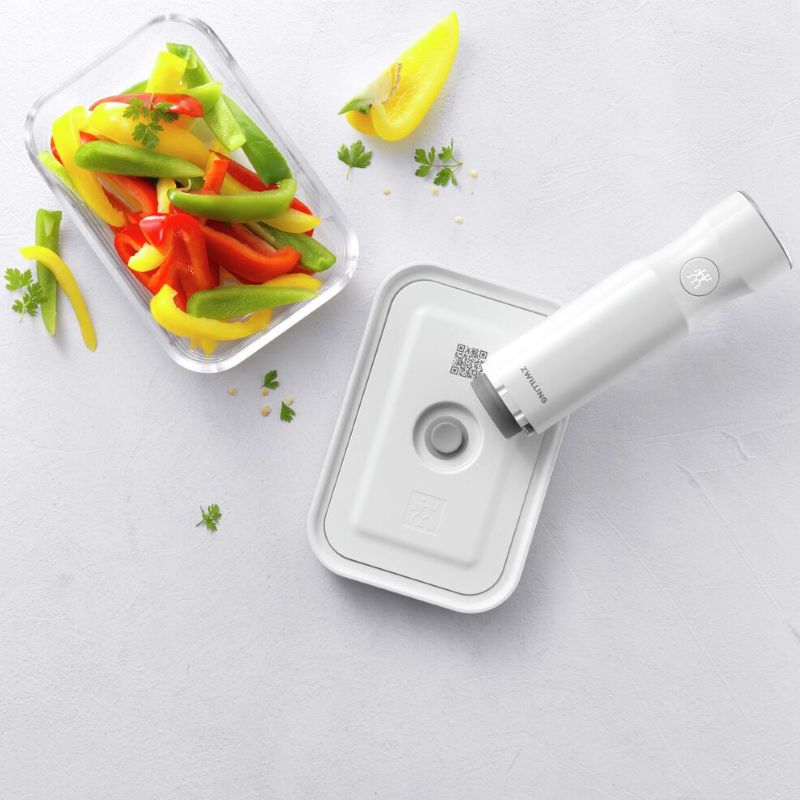 Вакуумний контейнер Fresh & Save - це можливість дотримуватися здорового способу життя, економити час та гроші, і викидати менше продуктів у сміття! Як це працює? Просто покладіть їжу, що залишилася, в контейнер і за допомогою насоса створіть вакуумне середовище: встановіть насос на клапан контейнера - одним натисканням кнопки він видалить повітря за лічені секунди і зупиниться сам автоматично. У додатку ZWILLING Culinary World ви зможете легко стежити за продуктами: просто відскануйте QR-код на кришці контейнера і отримуйте необхідну інформацію - коли прийде час використати продукти, додаток автоматично відправить вам нагадування. Вакуумний контейнер стійкий до заморожування, підходить для мікрохвильової печі і посудомийної машини.