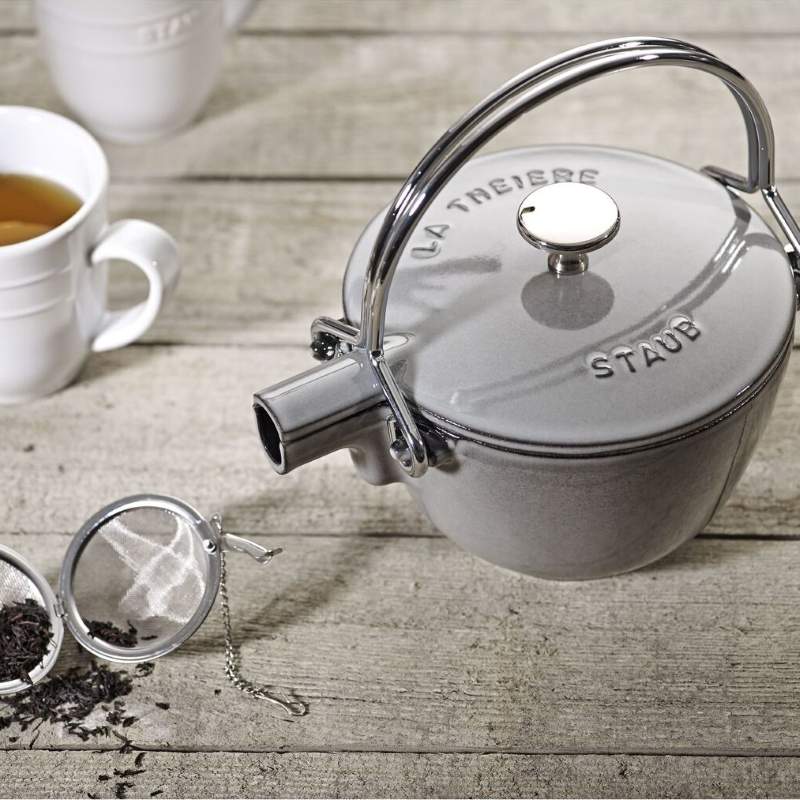 Для ідеальної чайної насолоди вода повинна швидко нагрітися, а потім довго залишатись теплою. У випадку чайника Staub це забезпечується винятковими здібностями чавуну: він дуже швидко поглинає тепло та рівномірно віддає його всередину. Чорне емальоване покриття усередині чайника дозволяє зберегти справжній смак чаю. У комплект до чайника входить ситечко для чаю, яке кріпиться до внутрішньої сторони кришки. Ручки з нержавіючої сталі не нагріваються і допомагають безпечно наливати напій, оскільки щільно закривають та утримують кришку.