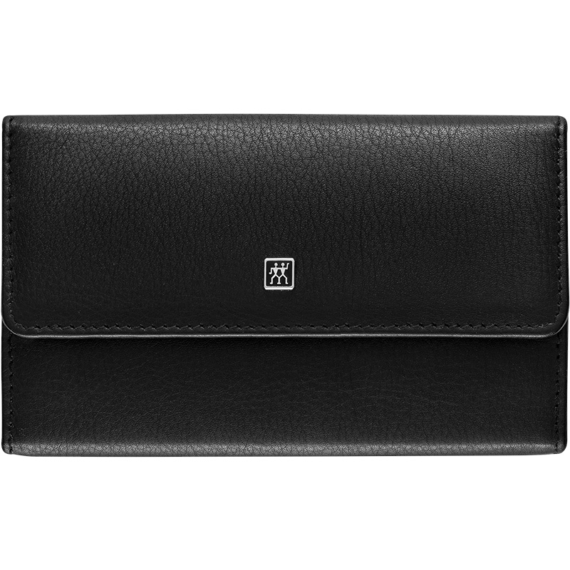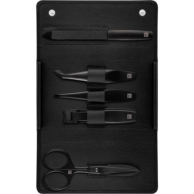 Современный черный футляр из натуральной кожи с застежкой-кнопкой и бархатной обложкой внутри содержит кусачки для ногтей, пинцет для кутикулы, сапфировую пилу для ногтей, скошенный пинцет и ножницы для бороды.
