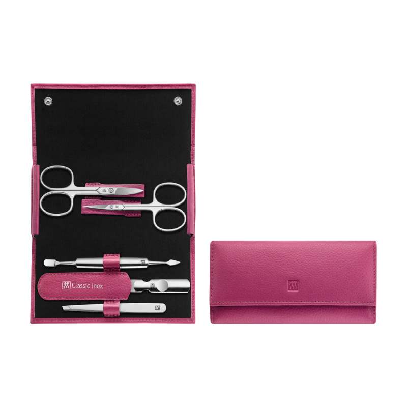 Материал инструментов: нержавеющая сталь холодной закалки FRIODUR®. Блестящая полировка. Розовый кожаный футляр.
