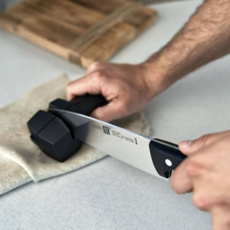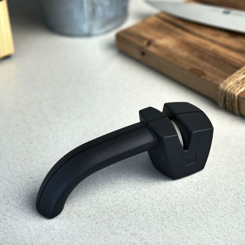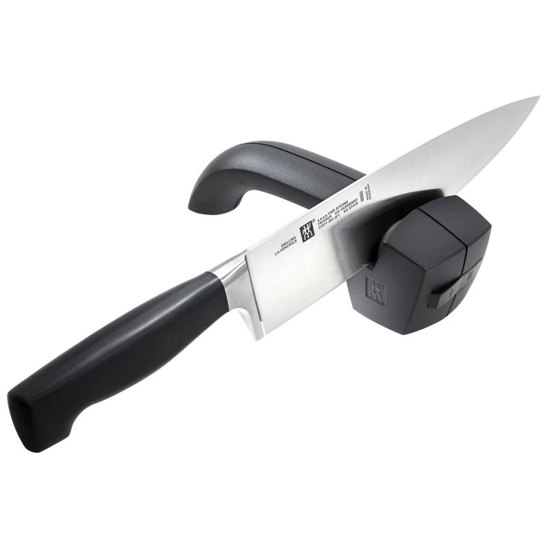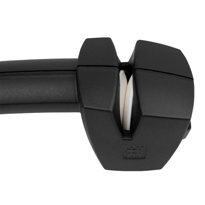 Точилка для ножей ZWILLING Sharp Pro - практичный аксессуар из черного пластика удобны как для правшей, так и для левшей, может использоваться новичками без каких-либо проблем. Благодаря своей компактной конструкции прекрасно дополнит вашу кухню и даст возможность самостоятельно затачивать старые ножи с тупыми лезвиями. Подходит для заточки всех типов ножей c гладкой режущей кромкой, кроме ножей с покрытием, зубчатых и ножей азиатского типа (сантоку). С помощью боковой кнопки переключается режим заточки (1 - для грубой заточки и удаления неровностей; 2 - для тонкой заточки, легкого подтачивания, полировки).
