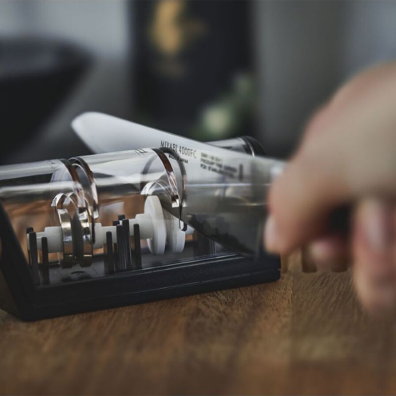 С помощью точила для ножей Miyabi Ваши ножи можно заточить более плавно и с большим комфортом. Точилка с керамическими роликами имеет уже предустановленный угол заточки так, что Ваш нож всегда будет находиться в правильном положении. Для заточки лезвие сначала протягивают через ролик с алмазным покрытием - это дает легкую базовую заточку. Затем вы несколько раз протягиваете лезвие через керамические ролики - это снова делает нож острым. Точилка для ножей надежно стоит на рабочей поверхности благодаря силиконовым вставкам на нижней стороне. Его ручка эргономичной формы изготовлена из пластика, не требующего особого ухода, и одинаково удобна как правшам, так и левшам. С помощью этой точилки для ножей вы можете точить не только ножи MIYABI, он также подходит для лезвий ножей из других марок стали, если они не имеют зубцов.