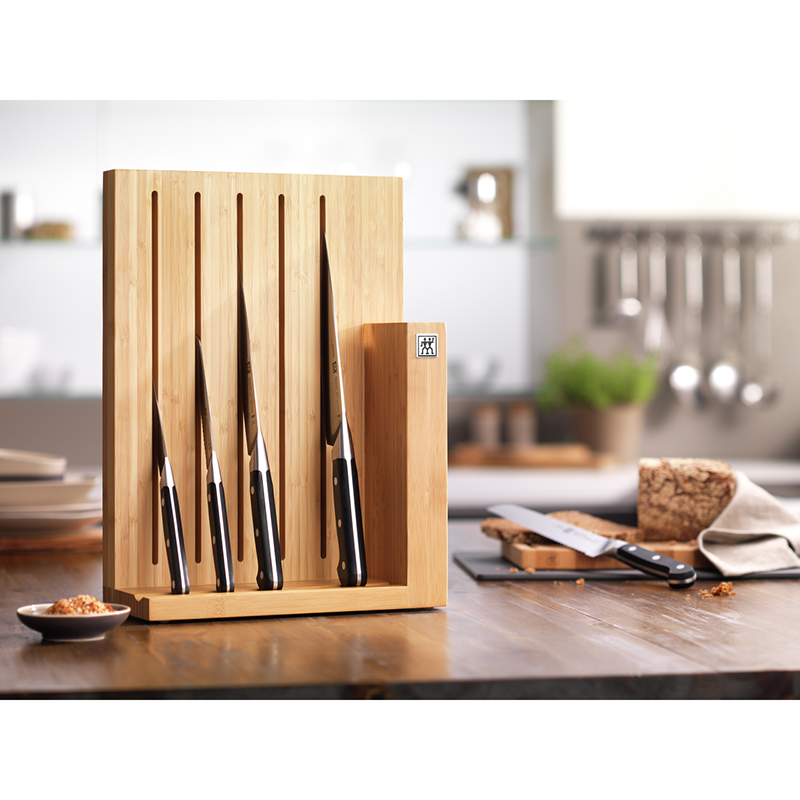 Практичный и элегантный блок из бамбука с ножами линейки ZWILLING® Pro профессионально оснащает вашу кухню и обогащает ее инновационными режущими инструментами, которые открывают совершенно новые возможности в мире кулинарии. С этим набором вы получите пять эксклюзивных кухонных принадлежностей, среди которых нож для овощей, универсальный нож, нож для мяса, поварской нож и нож для хлеба для любых повседневных ситуаций на кухне.