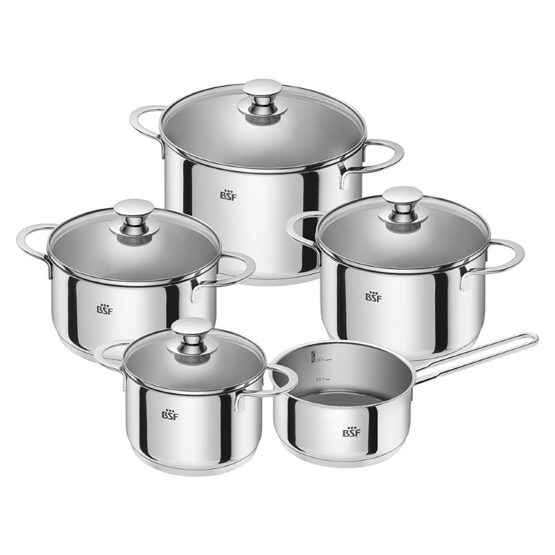 Набор кастрюль Bordeaux изготовлен из высококачественной нержавеющей стали с высокой стойкостью к коррозии. Многослойное дно с алюминиевой сердцевиной равномерно распределяет тепло по всему корпусу и способствует быстрому разогреву кастрюли. Все кастрюли, кроме ковша, укомплектованы стеклянными крышками, которые плотно закрываются и позволяют готовить пищу быстро и с сохранением витаминов.