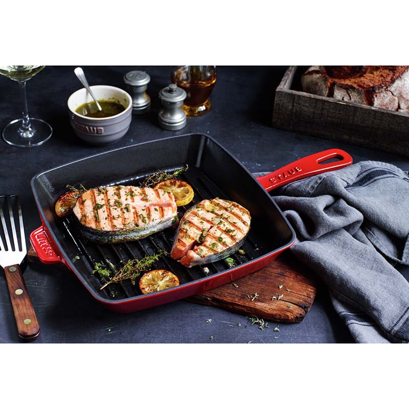 Предназначена для вкусного и быстрого приготовления блюд с эффектом гриля. Благодаря ребристой поверхности сковородки, можно жарить мясо, рыбу и овощи на небольшом количестве масла или без него. Сковорода изготовлена из литого чугуна, покрыта с внешней и внутренней стороны двойным слоем эмали, благодаря чему сковорода обладает антипригарными свойствами.