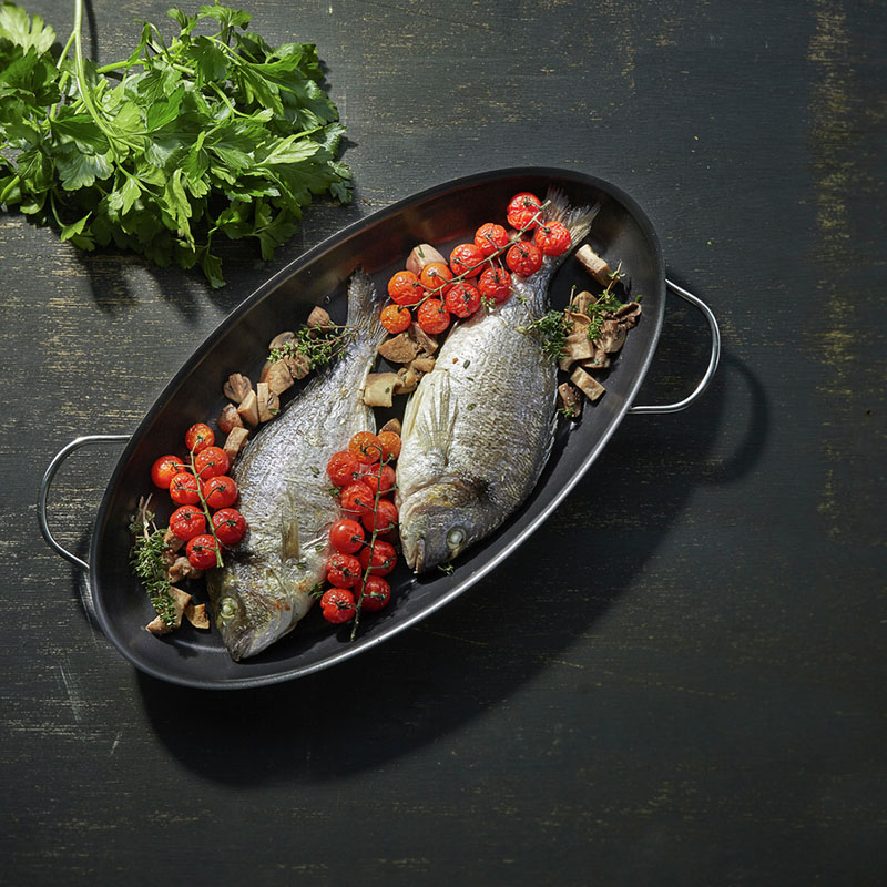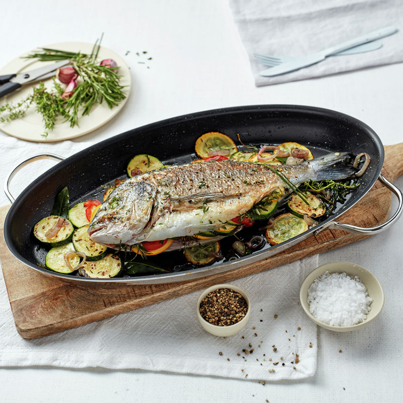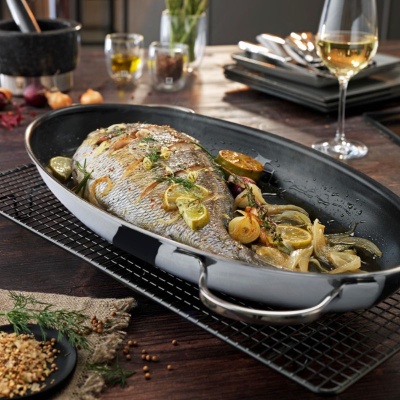 Эта сковорода для рыбы овальной формы 45 x 24 см предлагает достаточно места, чтобы мягко и эффективно переворачивать рыбу, которую готовите. Из-за антипригарного покрытия сковороды во время приготовления нужно использовать очень мало жира, что в результате делает рыбное блюдо легким и вкусным. В процессе приготовления рекомендуется использовать только силиконовые или деревянные аксессуары (лопатки, ложки и тд). Создавайте непревзойденные гастрономические шедевры с надежной и эффективной сковородой для рыбы от Demeyere, которая станет настоящей находкой для любителей рыбных блюд.