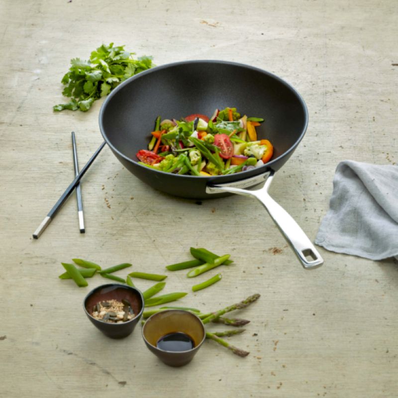 Сковорода-вок ALU PRO 5 очень прочная, но в то же время легкая и многофункциональная - с ней вы можете приготовить как вкусные ежедневные, так и удивительные экзотические блюда. Алюминиевое дно толщиной пять миллиметров равномерно распределяет тепло и сковорода очень быстро реагирует, как только вы переключаетесь на другой режим приготовления. Но главные преимущества этой посуды - здоровое питание и существенная экономия: для приготовления нужно совсем немного жира. Также в процессе приготовления рекомендуется использовать только силиконовые или деревянные аксессуары. Немаловажен в этой серии и дизайн - матовый черный алюминий красиво контрастирует с блестящей ручкой из нержавеющей стали.