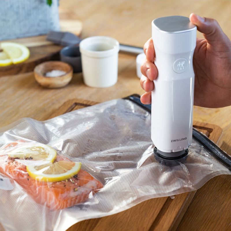Вакуумные пакеты Fresh & Save применяются вместе с вакуумным насосом и позволяют хранить продукты свежими до пяти раз дольше, чем обычно. С их помощью можно замораживать обеды, разогревать их, сохранять продуктыи свежими длительное время или мариновать стейки для гриль-вечеринки. Как это работает: положите продукты в пакет и закройте его с помощью зип-молнии. Теперь установите беспроводной вакуумный насос на соответствующий клапан - после стыковки он удаляет воздух из пакетов за считанные секунды и автоматически останавливается, как только создается достаточный вакуум. Теперь все, что вам нужно сделать, это нажать кнопку в центре красного силиконового клапана, чтобы надежно закрыть его. Каждый пакет имеет индивидуальный идентификатор, чтобы вы могли быстро найти замороженные продукты. Просто отсканируйте QR-код и отследите вакуумный пакет через приложение ZWILLING Culinary World. Благодаря функции напоминаний в бесплатном приложении вы всегда будете знать, когда хранящиеся продукты нужно использовать.