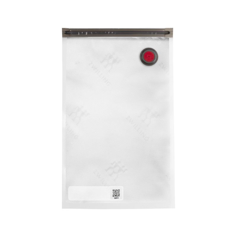 Вакуумные пакеты Fresh & Save применяются вместе с вакуумным насосом и позволяют хранить продукты свежими до пяти раз дольше, чем обычно. С их помощью можно замораживать обеды, разогревать их, сохранять продуктыи свежими длительное время или мариновать стейки для гриль-вечеринки.  Как это работает: положите продукты в пакет и закройте его с помощью зип-молнии. Теперь установите беспроводной вакуумный насос на соответствующий клапан - после стыковки он удаляет воздух из пакетов за считанные секунды и автоматически останавливается, как только создается достаточный вакуум. Теперь все, что вам нужно сделать, это нажать кнопку в центре красного силиконового клапана, чтобы надежно закрыть его. Каждый пакет имеет индивидуальный идентификатор, чтобы вы могли быстро найти замороженные продукты. Просто отсканируйте QR-код и отследите вакуумный пакет через приложение ZWILLING Culinary World. Благодаря функции напоминаний в бесплатном приложении вы всегда будете знать, когда хранящиеся продукты нужно использовать.