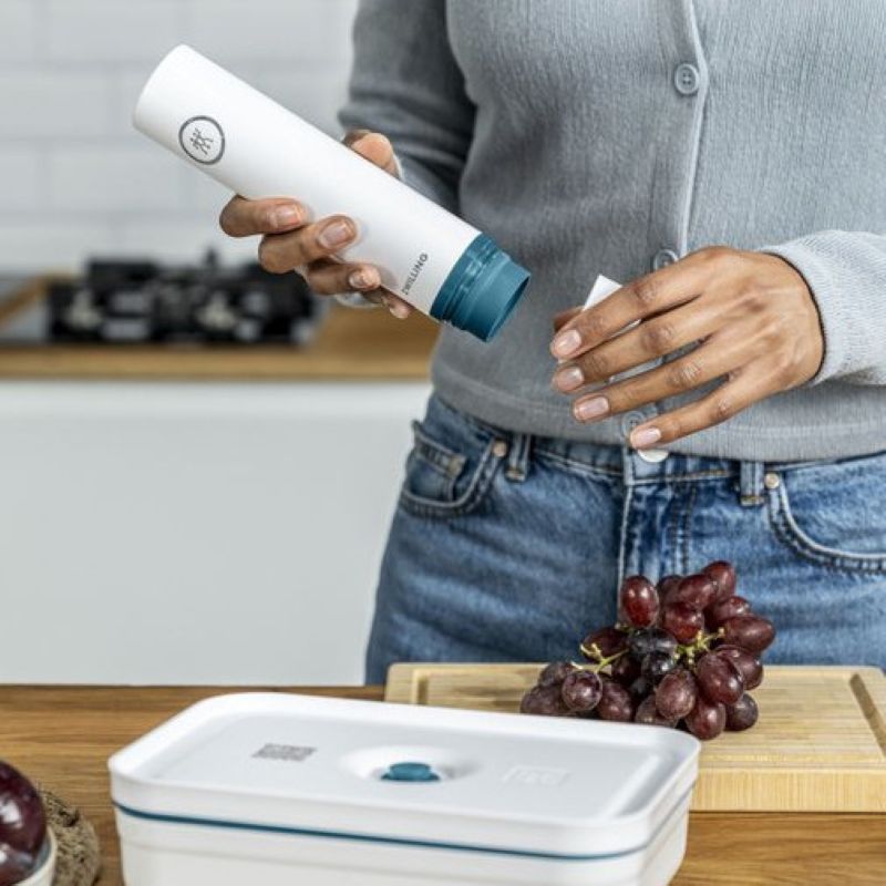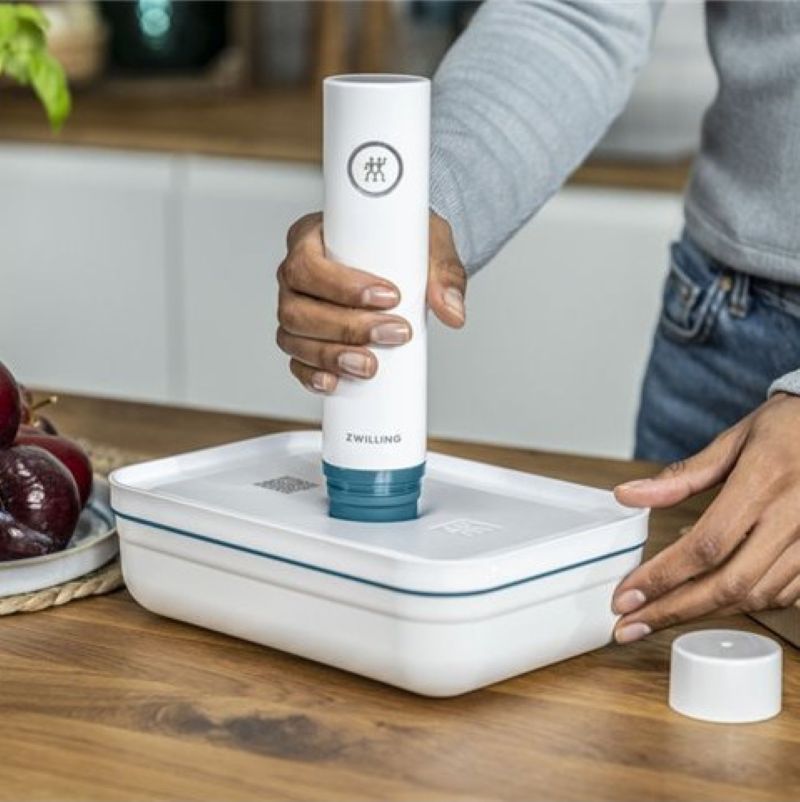 Вакуумный насос Fresh & Save лежит в основе интеллектуальной системы хранения от ZWILLING. Элегантный, бесшумный беспроводной вакуумный насос за считанные секунды удаляет воздух из наших вакуумных контейнеров и пакетов и надежно сохраняет ароматы и витамины. Он автоматически останавливается после создания достаточного вакуума. Оснащенный литий-ионным аккумулятором с длительным сроком службы, насос можно быстро заряжать с помощью входящего в комплект USB-порта через гнездо для зарядки, расположенное на помпе. С системой Fresh & Save вы можете делать покупки раз в неделю и охлаждать или замораживать свежие фрукты, овощи, мясо и рыбу в наших вакуумных контейнерах и пакетах, а также пользоваться преимуществами собственного рынка свежих продуктов у себя дома. Готовьте еду можно за несколько дней до употребления и наслаждайтесь ею такой же свежей, как в день ее приготовления. Готовьте мясо су-вид или замариновать мясо для гриля всего за 30 минут в вакуумных пакетах и контейнерах.
