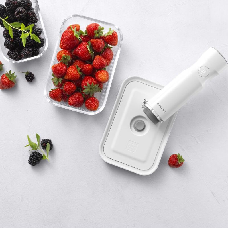 Вакуумные контейнеры Fresh & Save применяются вместе с вакуумным насосом и позволяют хранить продукты свежими до пяти раз дольше, чем обычно. С их помощью можно замораживать обеды, разогревать их, сохранять продуктыи свежими длительное время или мариновать стейки для гриль-вечеринки. Как это работает: положите продукты в контейнер и закройте его крышкой. Теперь установите беспроводной вакуумный насос на соответствующий клапан - после стыковки он удаляет воздух из контейнера за считанные секунды и автоматически останавливается, как только создается достаточный вакуум. Каждый контейнер имеет индивидуальный идентификатор, чтобы вы могли быстро найти информацию о своих продуктах. Просто отсканируйте QR-код и отследите вакуумный контейнер через приложение ZWILLING Culinary World. Благодаря функции напоминаний в бесплатном приложении вы всегда будете знать, когда хранящиеся продукты нужно использовать. Кликай здесь и смотри видеообзор - краткое пособие по эксплуатации.