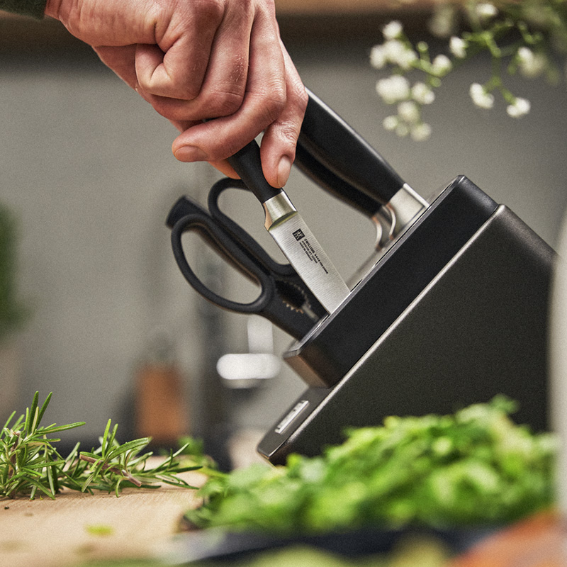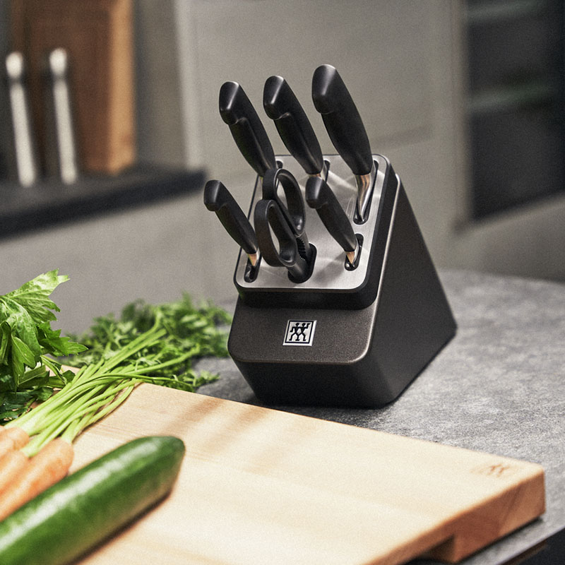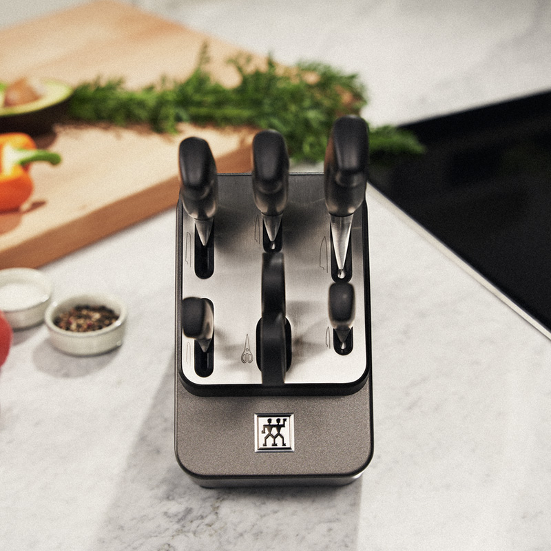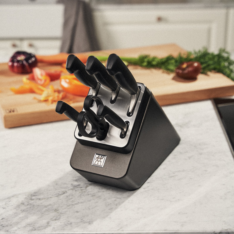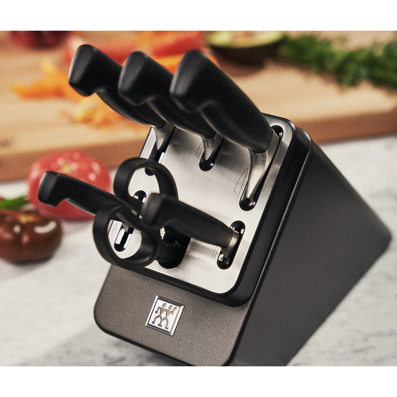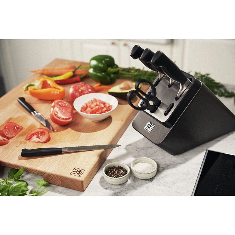 Набір ZWILLING Sharp Block укомплектований ножами із серії Four Star. Завдяки стильним темно-сірим тонам, цей блок ідеально підійде до будь-якого інтер'єру. Всередині блоку розташовані керамічні бруски для підточування, які інтегровані у відсіки ножів з гладкою кромкою (ніж для овочів, ніж для м'яса та шеф-ніж). Кожен раз, коли ви виймаєте або вставляєте ніж, ріжуча кромка автоматично підгострюється і, таким чином, ножі завжди готові до використання. Щоб не переплутати місцезнаходження ножів, нативно зрозумілі піктограми показують, який відсік підходить для якої форми леза. Блок також укомплектований кришкою з нержавіючої сталі для додаткової міцності.